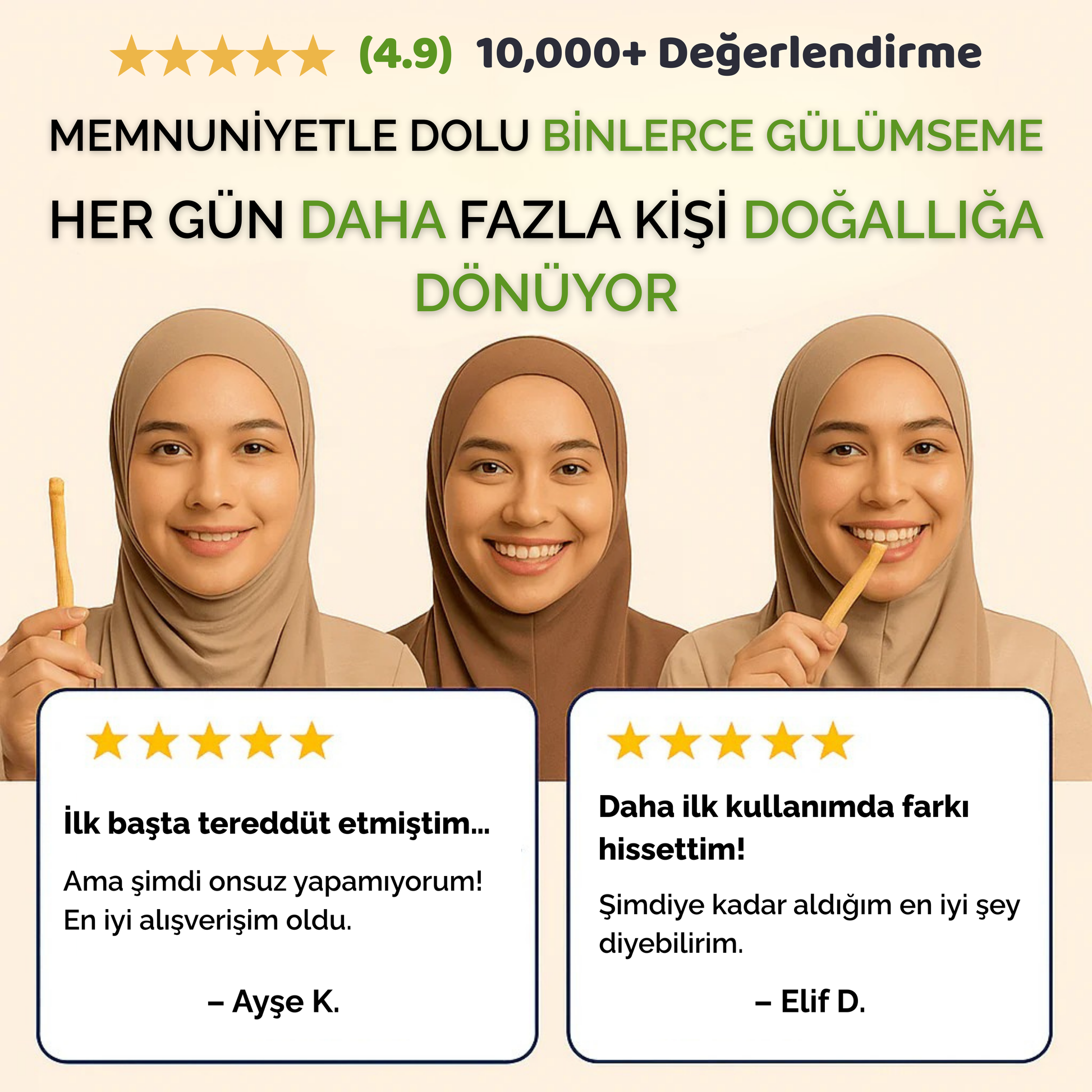 Vücudunuzla uyum içinde çalıştığı için ona karşı değil. Kimyasal diş macunları mineye zarar verebilir ve ağız mikrobiyomunuzu bozabilirken, Misvak dişleri doğal olarak güçlendirir, nefesi ferahlatır ve diş eti sağlığını destekler—herhangi bir toksin, katkı maddesi veya yapay bileşen olmadan.